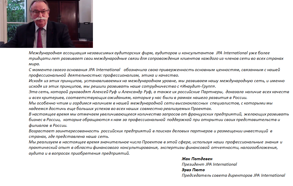 АО "Инаудит" является национальным членом международной сети JPA International, объединяющей более 150 ведущих независимых бухгалтерских, аудиторских и консалтинговых фирм в 56 странах мира, что позволяет представлять интересы клиентов Инаудит-Групп не только в России, но и за рубежом, а также сопровождать бизнес наших клиентов в следующих странах: